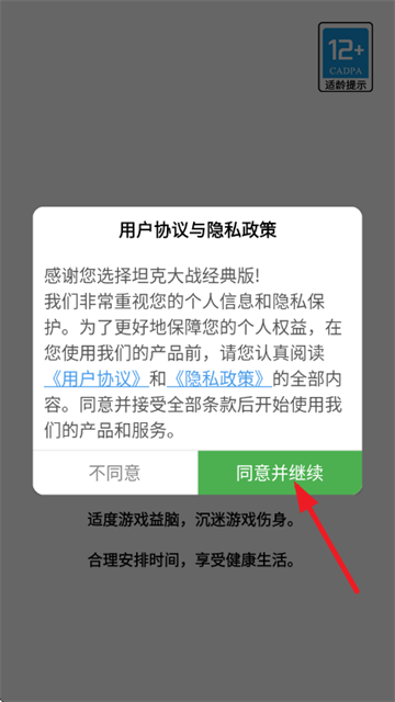 1、首先打开游戏,阅读并同意《用户协议》和《隐私政策》;