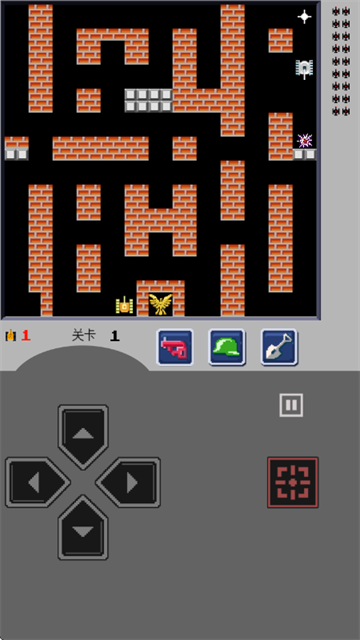 -关卡设置:游戏共有35个不同地图的关卡,每关有20辆敌方坦克,从关卡地图的不同方向发起进攻。玩家可按START键,当出现STAGE1时,用A或B键自选关卡。