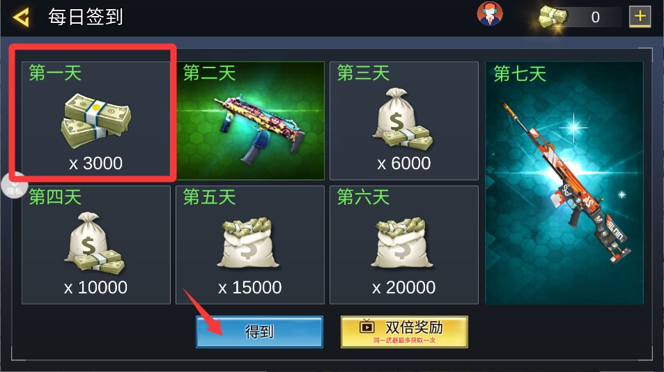1、登录游戏先点领取按钮,把新手装备和补给都拿到手,这些前期很有用别错过,记得每天签到领奖励。