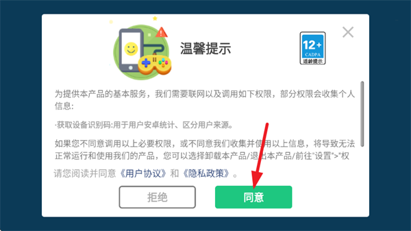 1、首先打开游戏,阅读并同意《用户协议》和《隐私政策》;