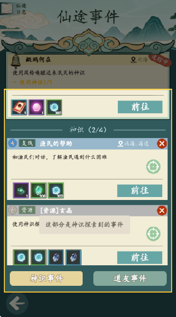在仙途日志里面你可以看到你未完成的支线地点,你可以去到对应的地方!使用神识探索有概率出现支线剧情,完成后可以获得支线感悟点