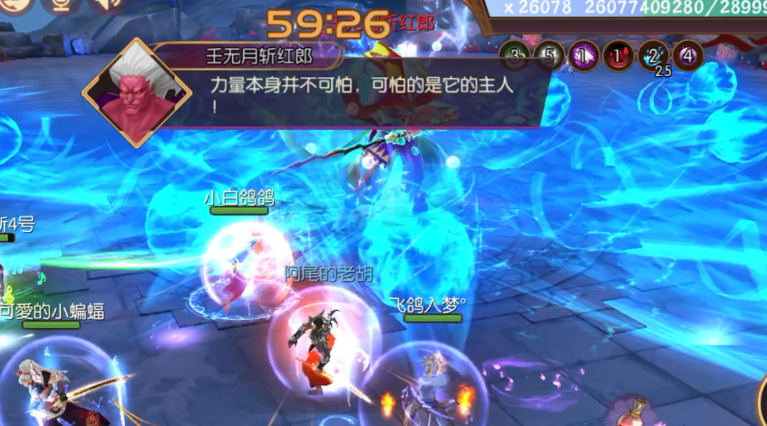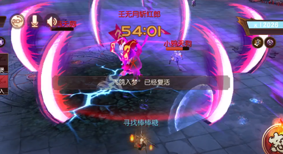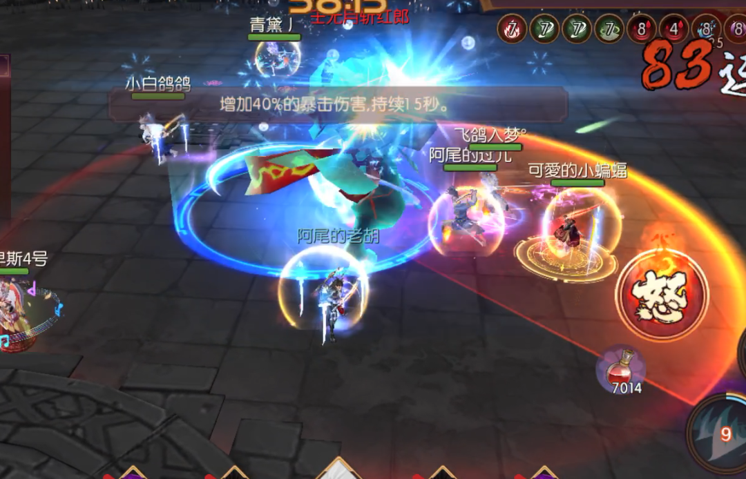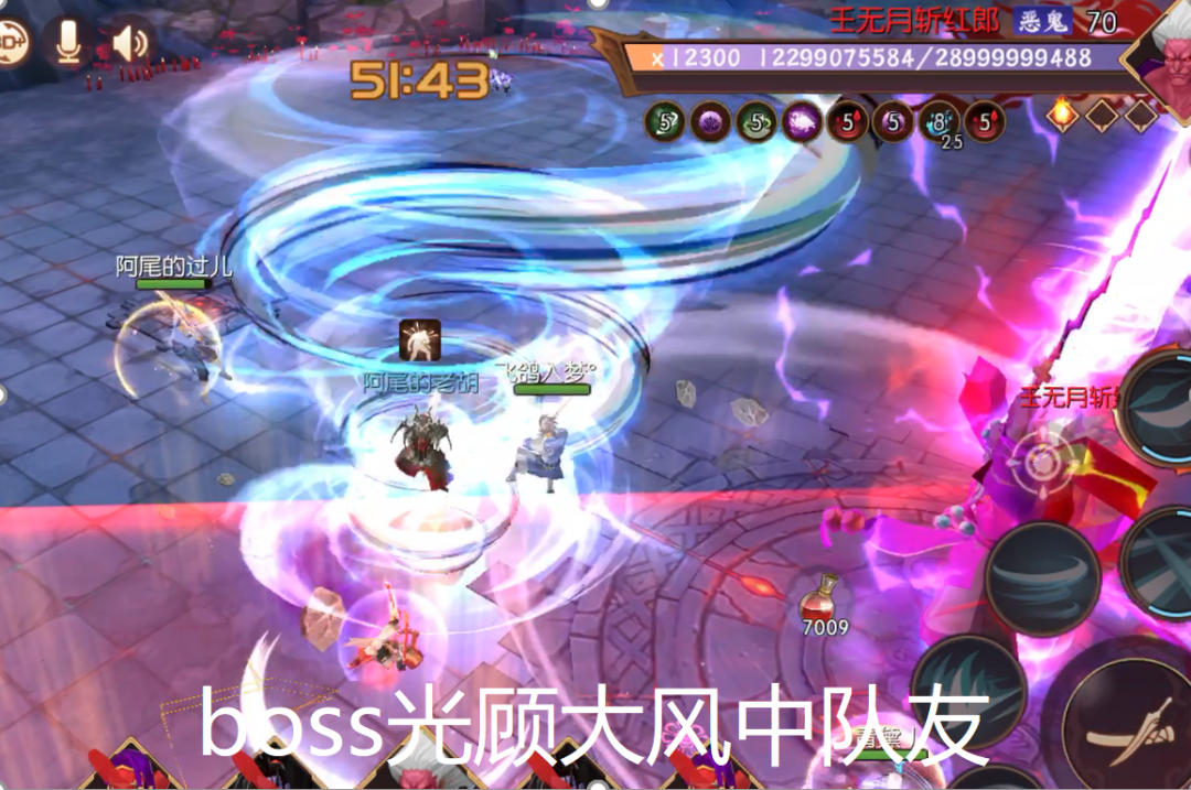 场上小鸦天狗集体打至丝血,1-2名低输出玩家专业收割四只鸦天狗,合成大风并被卷入吸引仇恨。其余玩家全力输出。