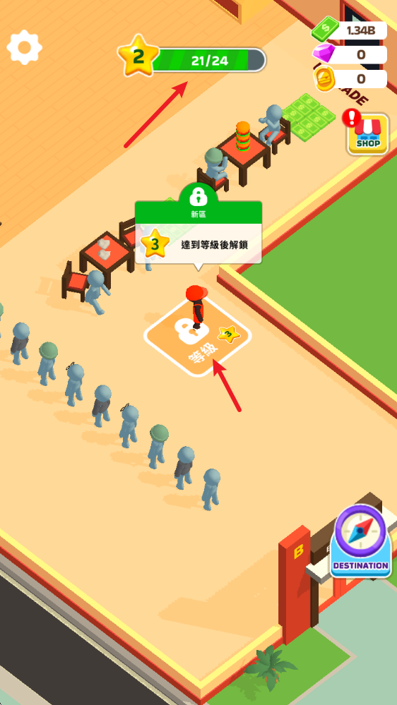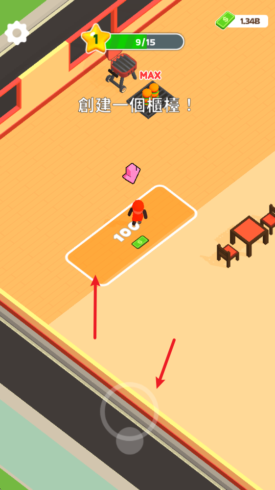 1、拖动屏幕即可控制角色移动,来到指定位置即可花钱建造设施。