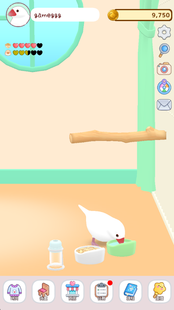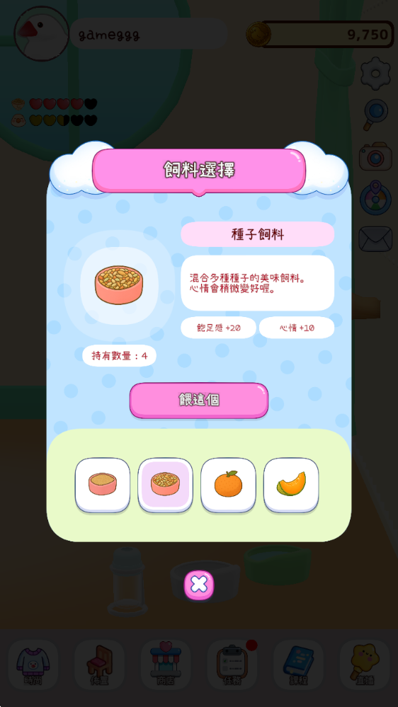 2、点击饲料碗就可以去放置各种食物,为其补充体力。