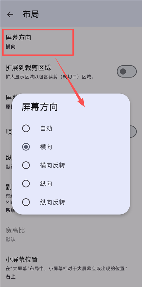 4、点击【屏幕方向】,支持横向、纵向等方向,玩家可根据游戏具体选择适合的屏幕方向。以横屏为例,选择【横向】。
