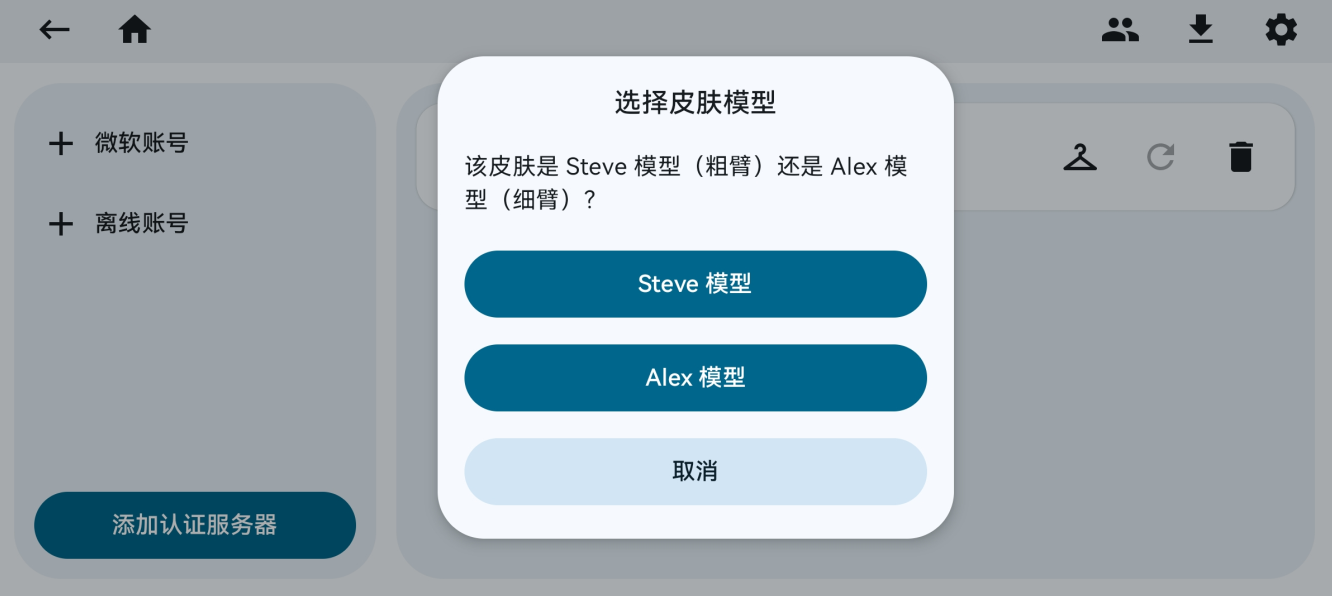 3、准备一个皮肤图片文件,仅限PNG格式,分辨率限制:64x64像素或64x32像素。之后点击账号旁边的衣架选项,在相册选择皮肤图片。