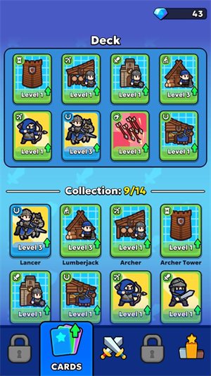 5、在主界面点击cards按钮可以更换上阵的卡牌,也可以消耗钻石对卡牌进行升级。