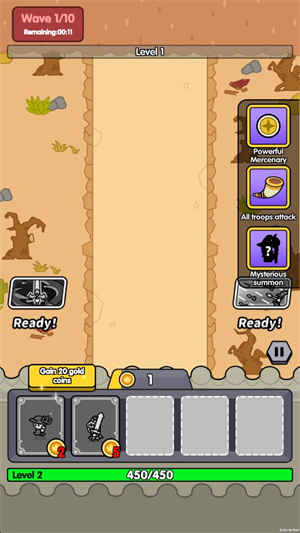 3、召唤不同的小兵需要的金币数量是不一样的,当击败敌人后会获得经验,提升等级后可以选择一个技能来强化小兵。