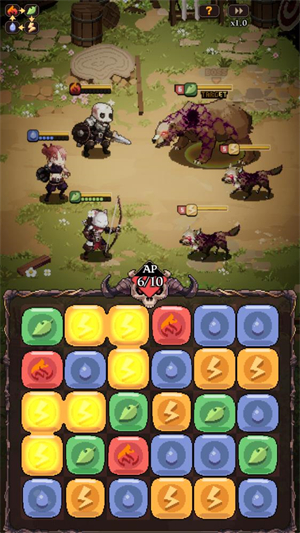 4、点击战斗开始后就可以开始闯关,有些关卡会在开始有一段剧情,剧情结束后就会进入战斗,进入战斗后玩家需要消除方块让角色攻击,每消除一个对应元素方块就可以让一位同元素角色进行攻击。