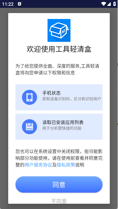 1、用户在本站下载工具轻清盒app,点击同意。