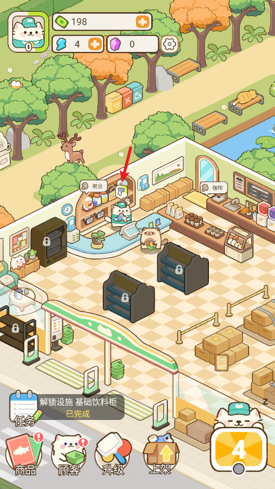 2、点击升级就能够对各个货架进行建设,提高收益。