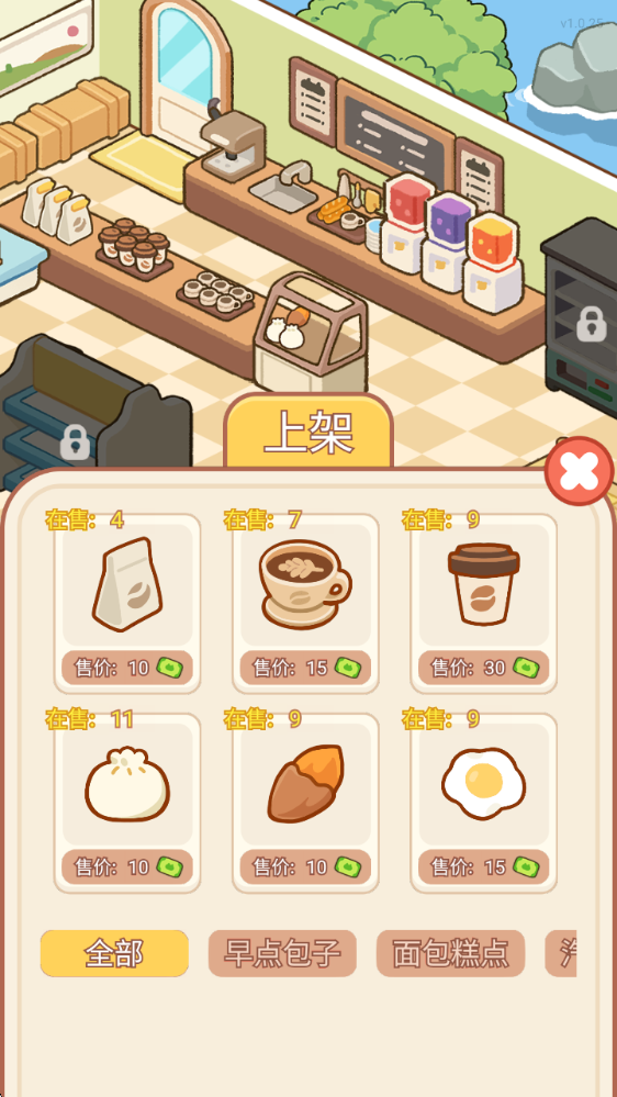 1、进入游戏后,点击下方的上架,我们就能够将各类商品摆放到货架上。