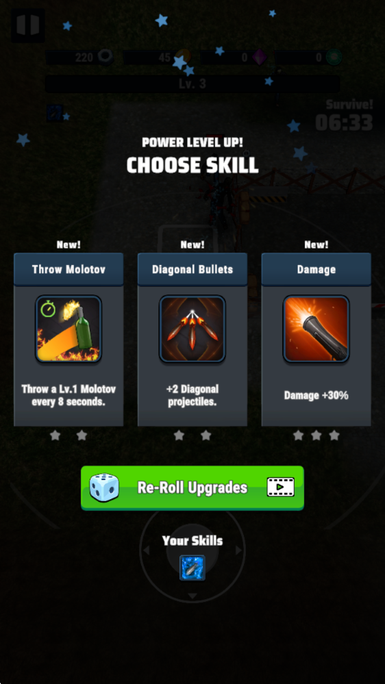 2、击败敌人可以获得经验,升级后可以从三个技能中选择一个获得。