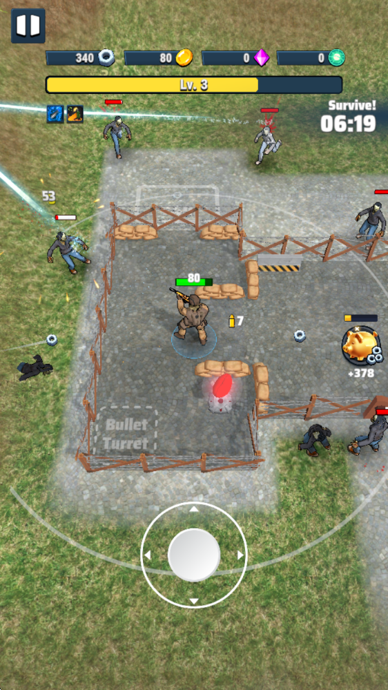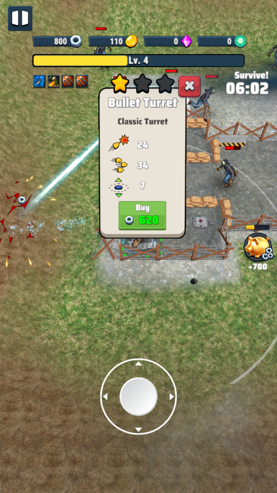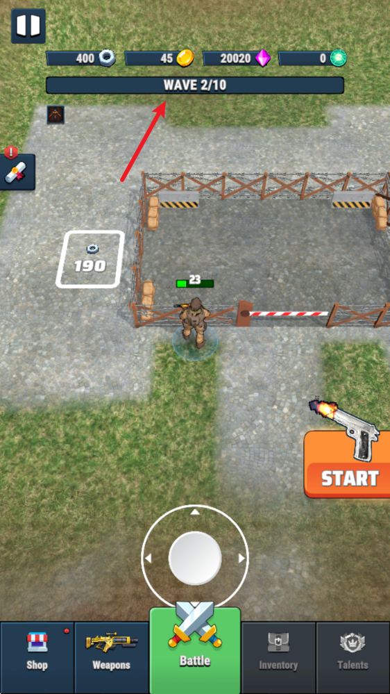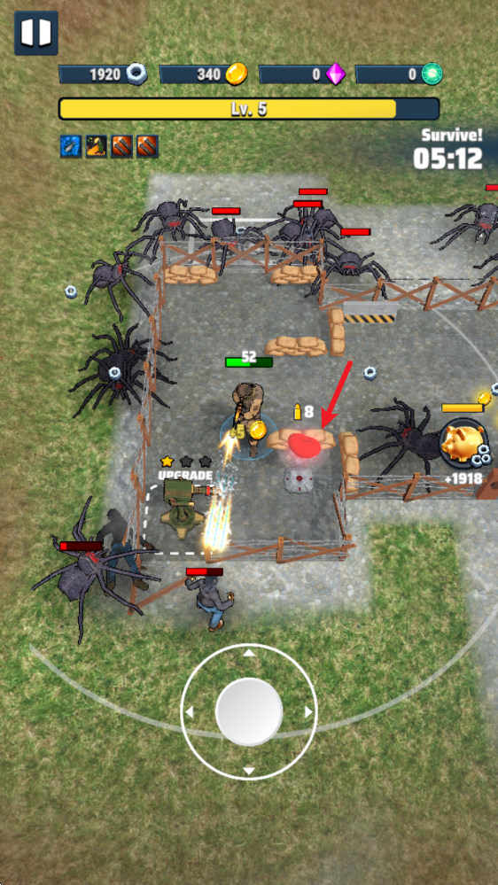 1、游戏中拖动虚拟摇杆即可移动,敌人靠近范围后即可射击。
