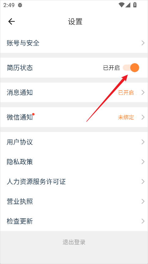 3、进入设置页面后,将【简历状态】的开关关闭;