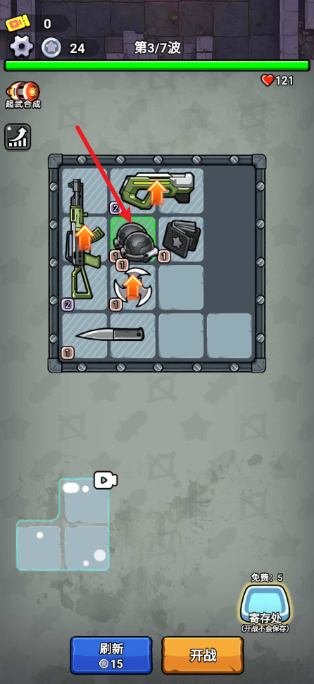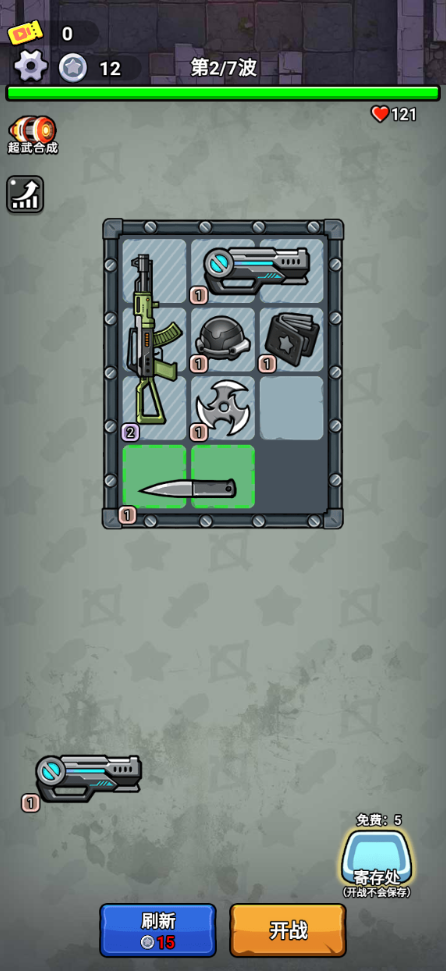 1、游戏中拖动下方的武器即可放入背包。