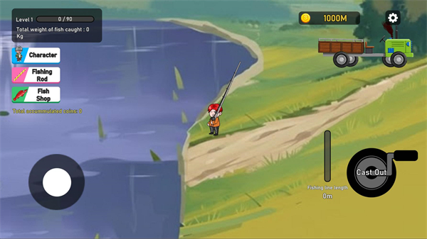 3、进入地图后滑动左边摇杆移动角色,点击右边的按钮就可以抛出鱼线进行钓鱼。