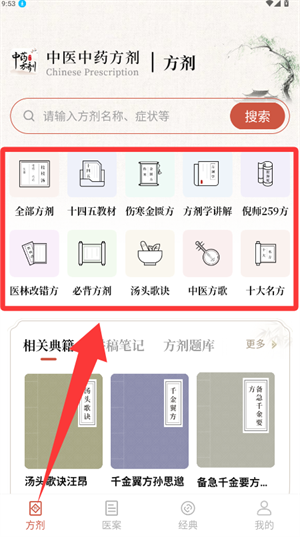 3、返回方剂界面选择分类,查看教材等对应方剂内容。