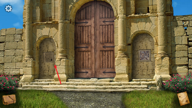 1、在简单略过剧情后,正式进入游戏,这里大门紧闭,点击两侧的图案来解谜。