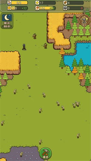2、正式开始后玩家可以点击下方建造按钮来修建不同的建筑,每个建筑会生产不同的资源。