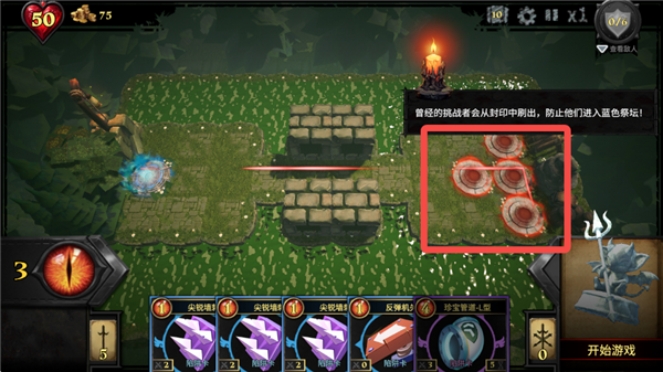 进入关卡后,将初始陷阱放置在地牢内的合适位置。布置完成后,点击右下方的【开始游戏】正式开启闯关。