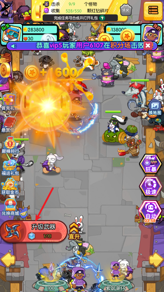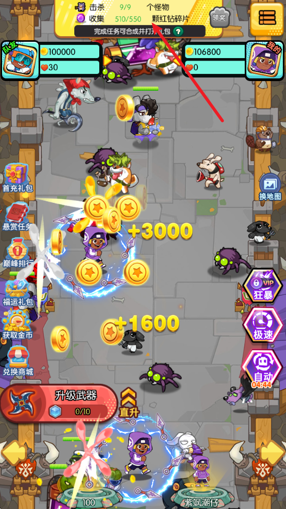 1、游戏中拖动屏幕即可控制自己的角色移动,攻击周围的敌人。