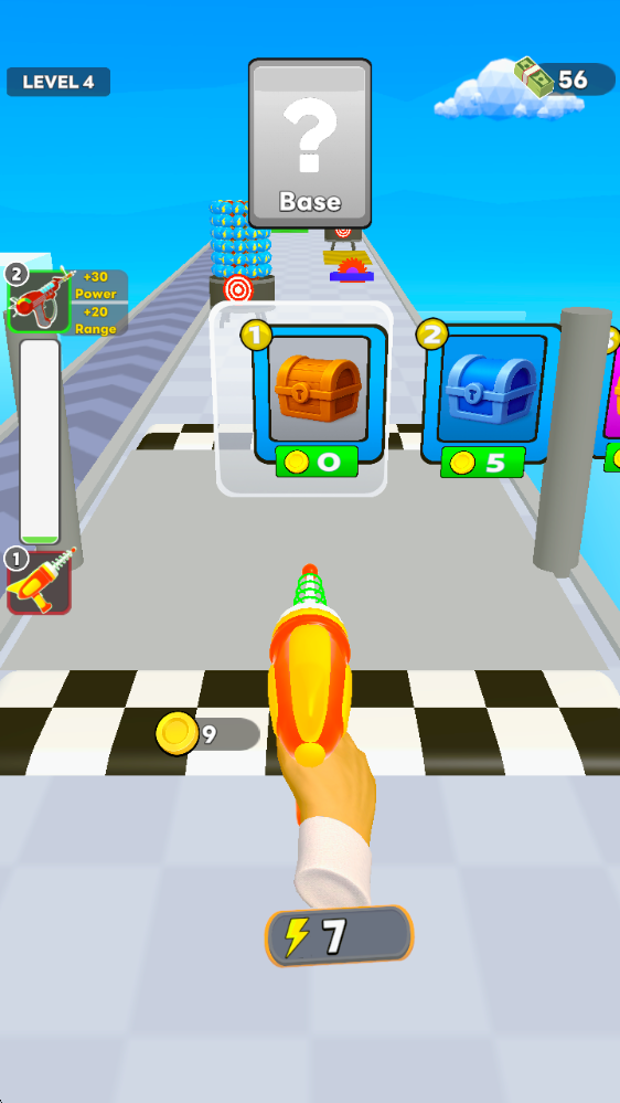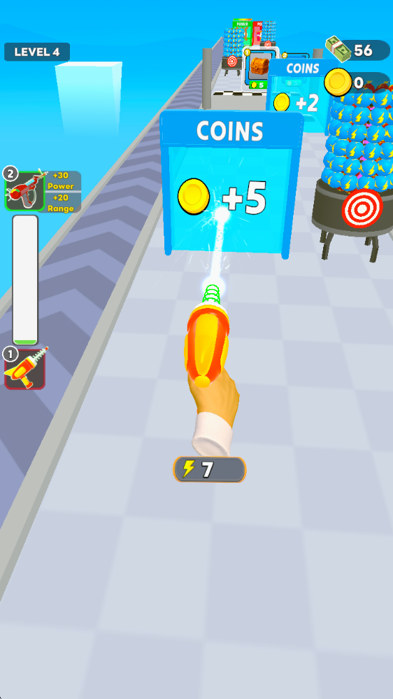 跑酷射击与能量收集:操控激光枪自动前行,滑动瞄准射击沿途的能量晶体、金币与武器原型,积累资源。