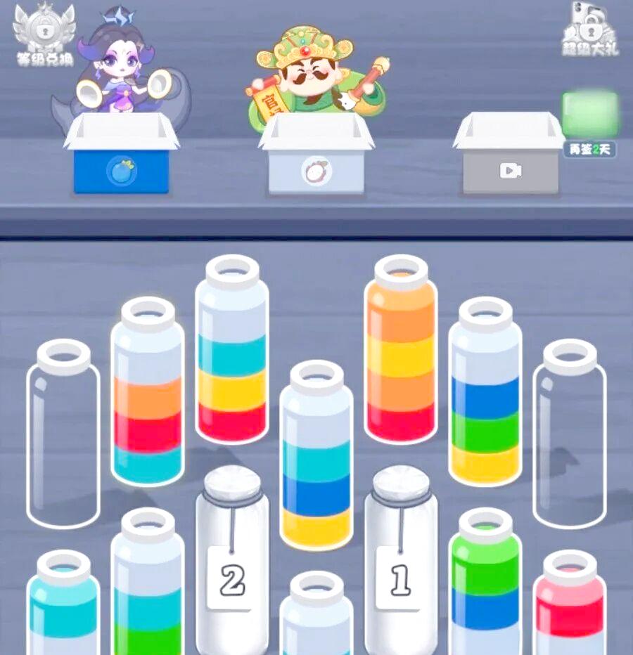 这款游戏颇具趣味,其画面中充斥着众多可爱的卡通小人物。游戏玩法相当直观:你需要将下方颜色相同的水倒入相应的瓶中。