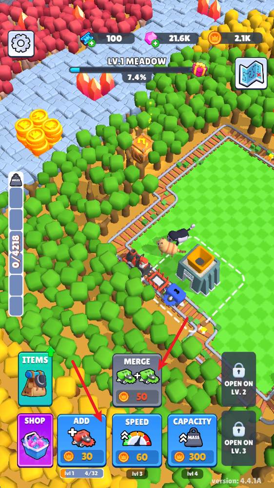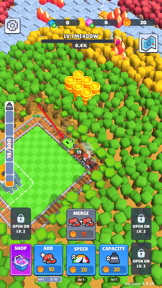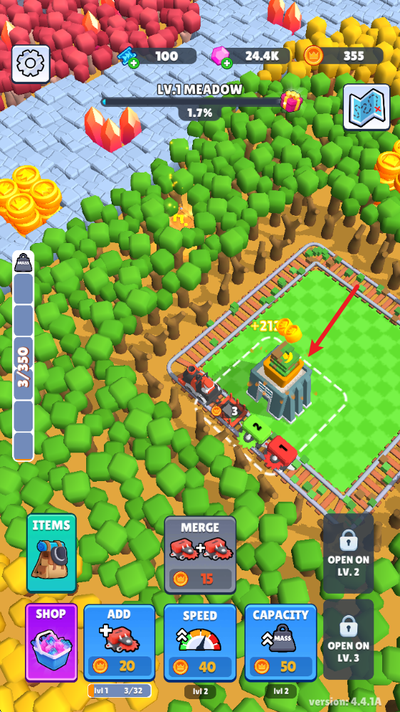 3、消耗金币就能够升级火车,并合成得到更好的伐木机器。