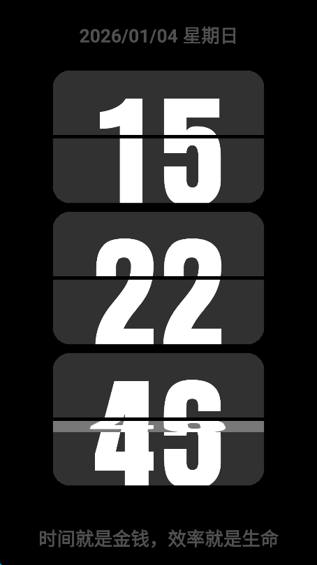 核心时钟显示与美化:提供标志性的经典翻页动画,支持横屏/竖屏显示。拥有复古、电子、辉光管、极简等多种时钟样式,并支持自定义字体、颜色、大小、背景图片及动态效果。