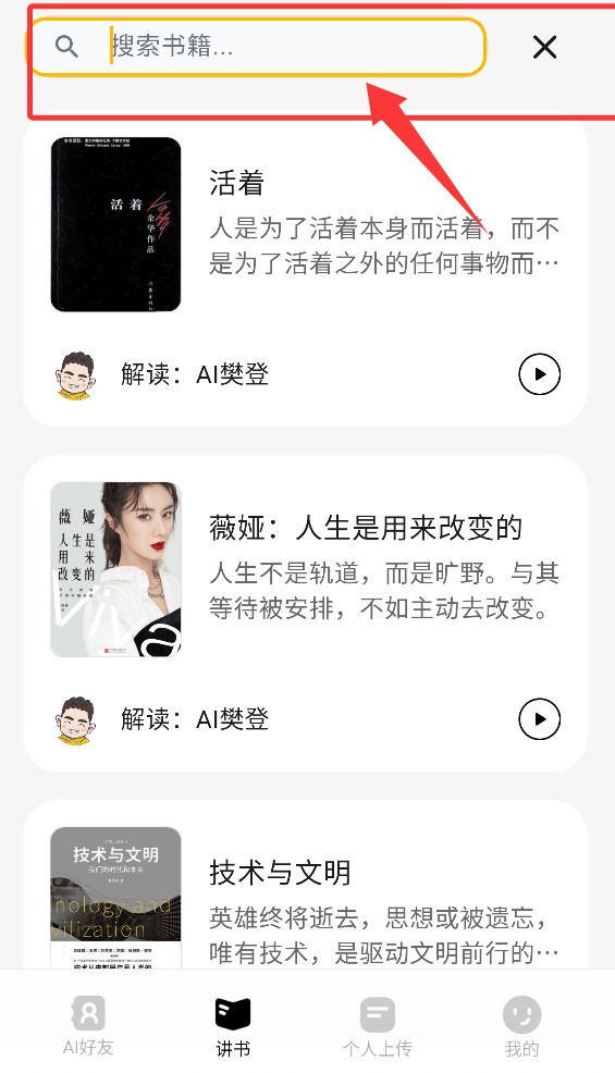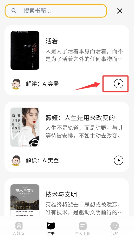 用ai找到你想听的书,AI樊登陪你聊书·解惑·读文档。有事问老樊,生活不为难,你的24h人生幕僚。结合一直很火的AI功能让你看书步骤更加简洁,不怕找错,直接问ai这个软件上的书籍内容,并且直接在线观看,让ai帮你整理分类收藏等等。