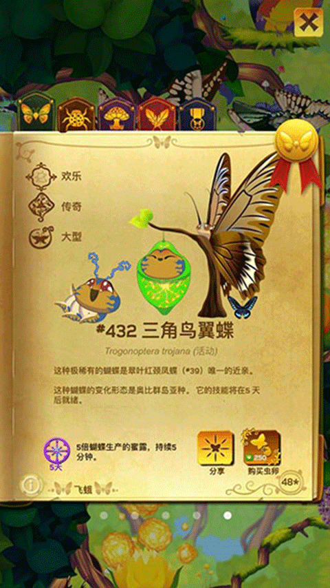 5、当幼虫完成结蛹与破茧过程后,即可解锁新的蝴蝶品种,并收录进百科图鉴。