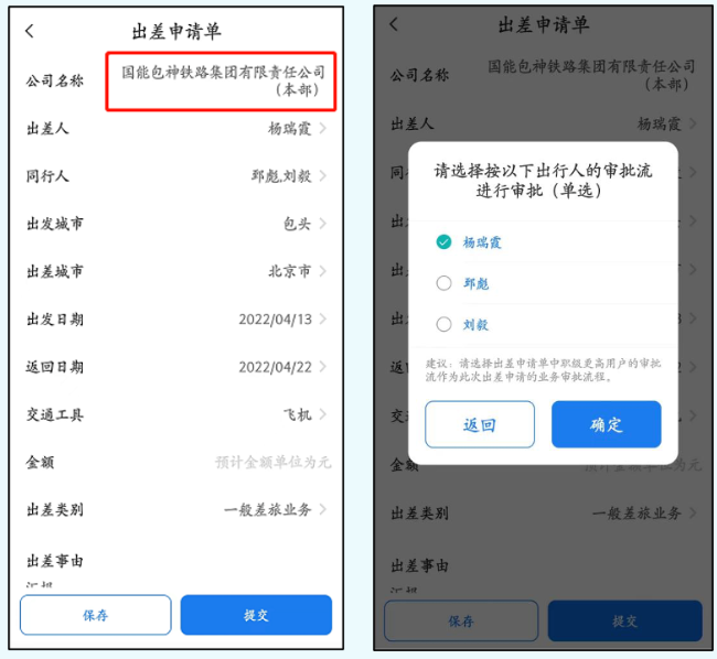 为全员服务的灵活流程设计:支持员工为自己、为领导、为同事提交申请,并灵活处理多人同行、紧急出差等复杂场景,高度适配大型企业的实际运作。
