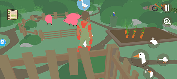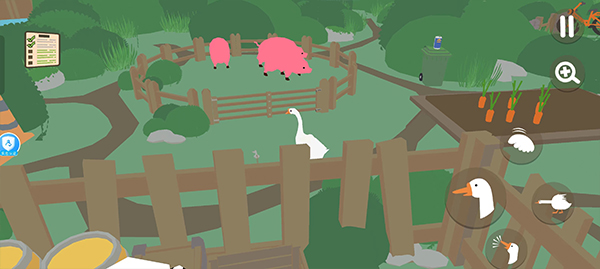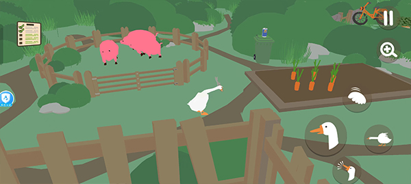 基础操作:大鹅可实现鸣叫、叼物、奔跑、下蹲、扇翅膀等动作,利用这些与环境和村民互动,比如叼走园丁的帽子、将商店商品弄乱、吓哭正在玩耍的小孩等。