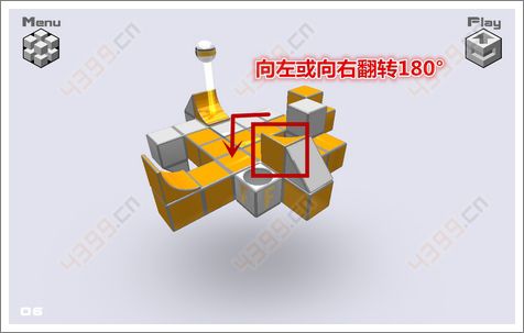 4.将灰色的斜坡向右翻转90°,实际上方块会向左翻转,这样既可填出一条路给小球了。