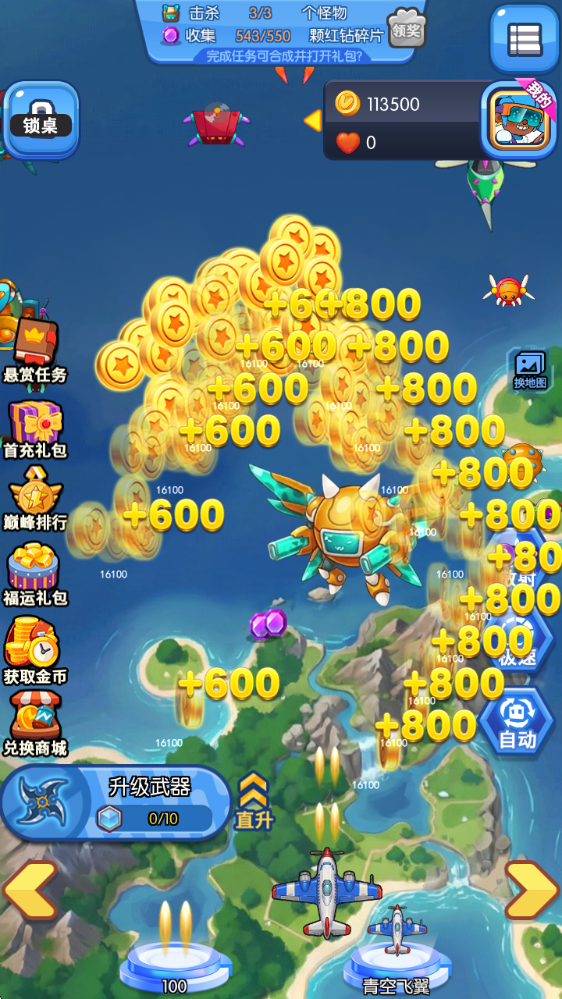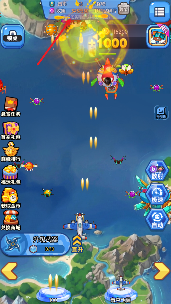 成长系统:通过击败敌人获取金币与资源,用于升级战机火力、速度等属性。
