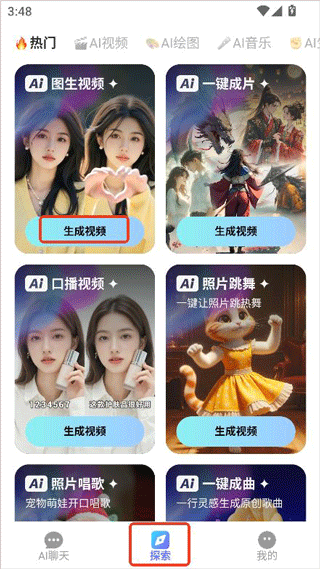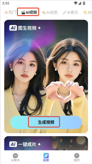 1、在探索栏中找到AI视频生成