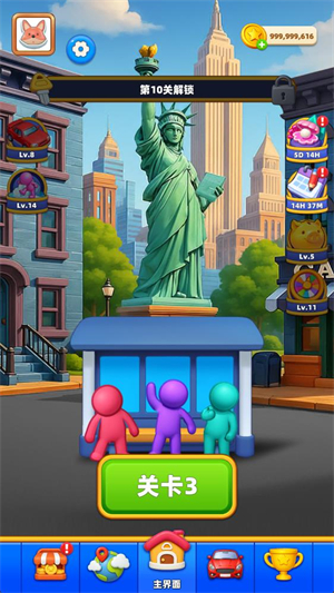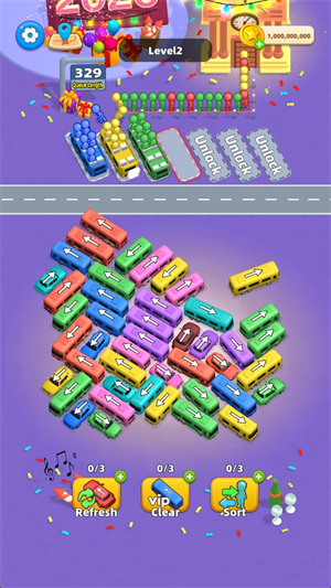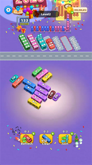 1、核心目标:通过移动关卡内的车辆,将所有彩色乘客运送至出口或指定位置,清空场景即可通关。