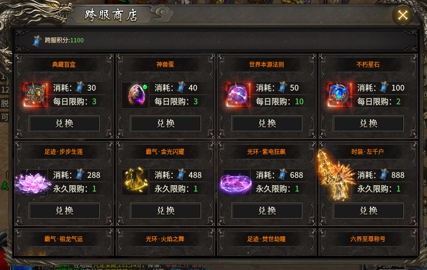 跨服积分可在积分商店兑换各种专属装扮、稀有材料。