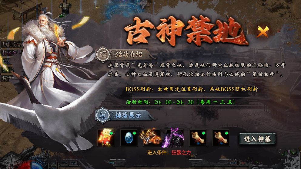 3. 古神禁地 活动时间 20:00-20:30(一,三,五)活动时间击杀怪物获得丰厚奖励