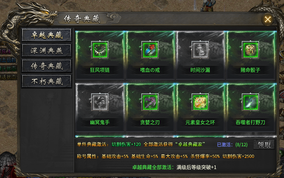 玩家可通过激活典藏获得切割、BOSS伤害、基础倍攻、最终攻击等大量属性,并且满级后等级突破+1。