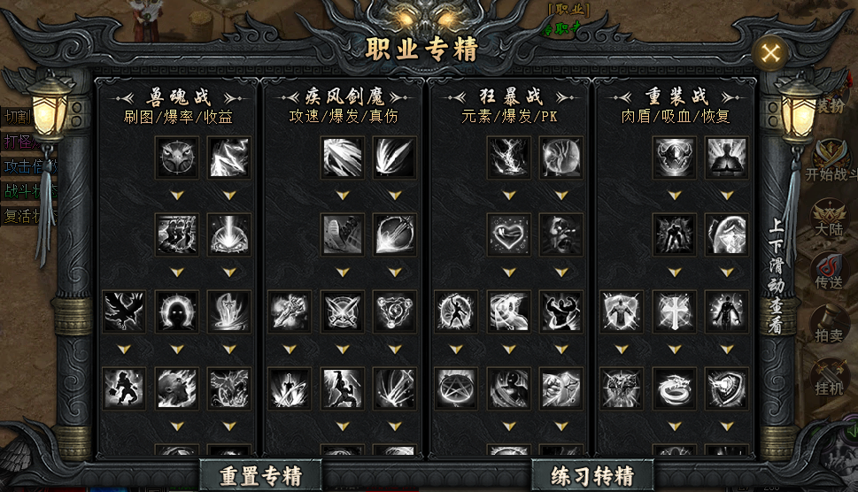2. 通过“转职专精”系统,选择职业强化方向,兽魂战/疾风剑魔/狂暴战/重装战。