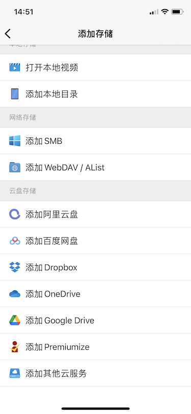 2.2:云盘:将云盘里的影片导入到VidHub进行整理、播放,具体请看新手入门,目前支持阿里云盘/百度网盘/Dropbox/OneDrive/GoogleDrive/Premiumize等;