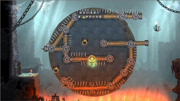 6、注意先跳到铁环上,再转动圆盘,等人物到达最顶端再放手,就可以跳下并抓住中间的铁环。此时再转动圆盘至水平就能跳出解救精灵了。
