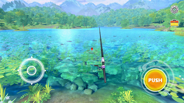 4、正式开始后左边控制鱼漂的位置,点击右边的push可以抛出鱼竿扔出鱼饵。