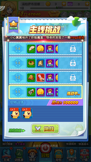 以主线挑战为核心推进方向,获取金币、经验、养成材料,快速提升训练家等级,闯关时注意总战力要求,若战力不足,返回精灵养成界面强化核心精灵,再重新挑战,避免盲目闯关浪费次数。