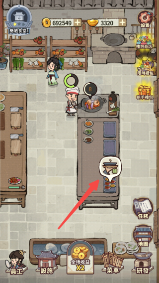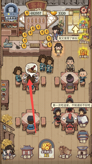 1、想要获得大量金钱,就要先了解有什么渠道可以获得。首先最基础的就是客人吃完饭后留下的费用,点击客人头上的气泡即可进入结算。