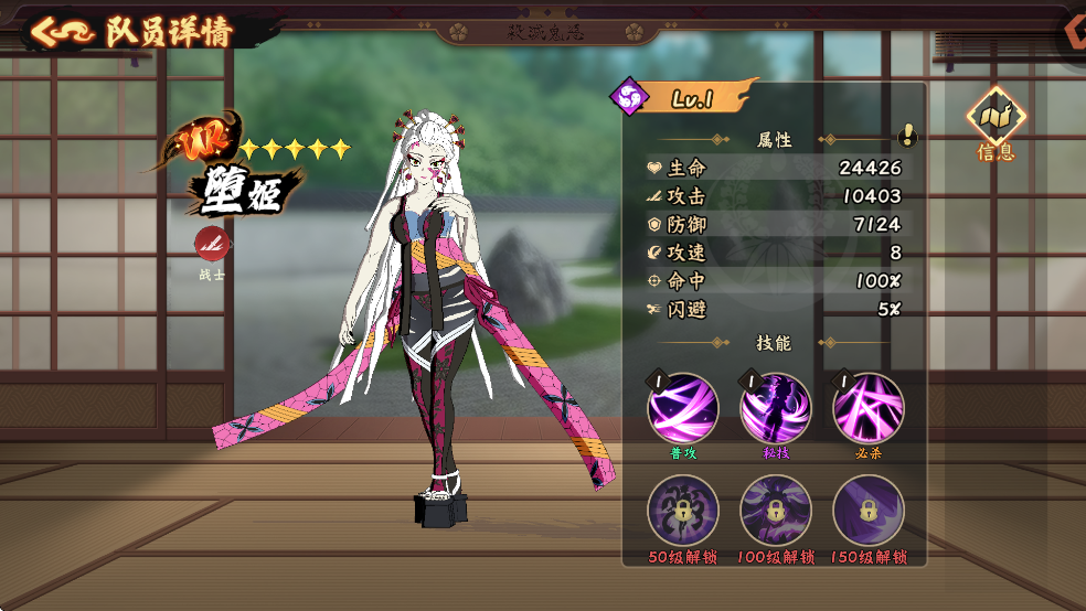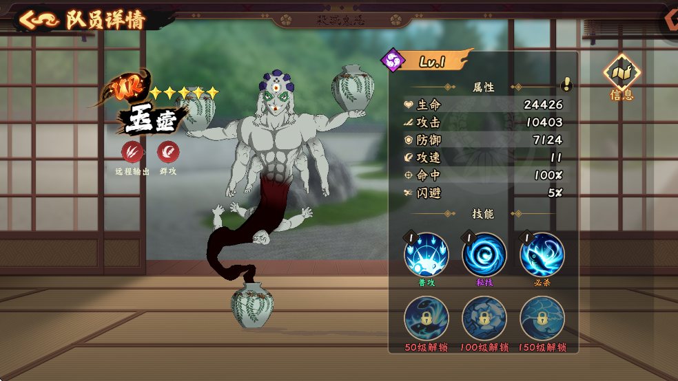 必杀技:【叁之型 巢绞】对前方大范围造成攻击力300%的伤害,对[标记]的目标额外提升60%的伤害、对所有命中的敌人有50%概率附加[禁疗]。