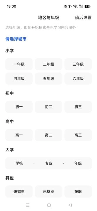 选择用户所在的地区和对应的年级,点击“稍后设置”按钮,即可进入使用界面。