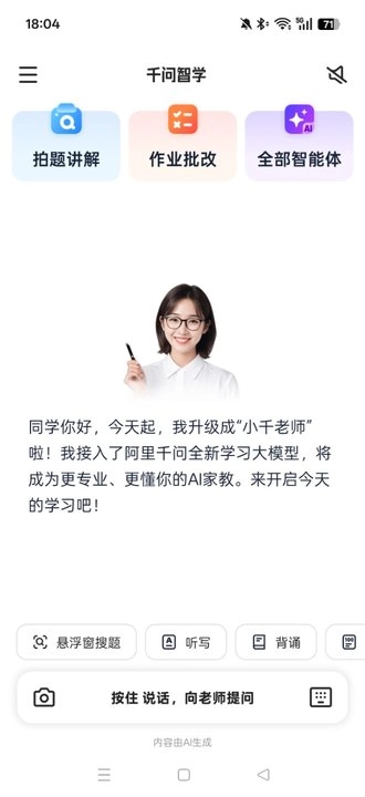 千问智学:千问品牌下的垂直教育产品,提供免费学习辅导(如解题、批改作业、错题分析)。仅面向学生群体,内置智能体“小千老师”支持拍照、语音、文本交互。